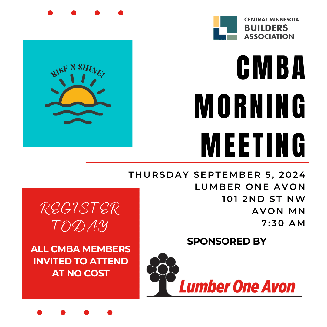 Join us for coffee and rolls as we hear from our Sponsor Lumber One, at their Avon location, on supplies and industry updates. You'll also hear what's happening in our Government Affairs office and at the CMBA!