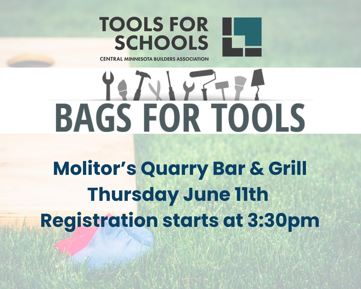 The Bags for Tools event is a great fundraiser opportunity for the Tools for Schools Fund. Local area students have built bean bag boards which will be used in the bean bag tournament. We will be hosting a 32-team double elimination tournament, registration begins at 3:30 and play starts at 4:00. Come join us for this fun event to support local area students!