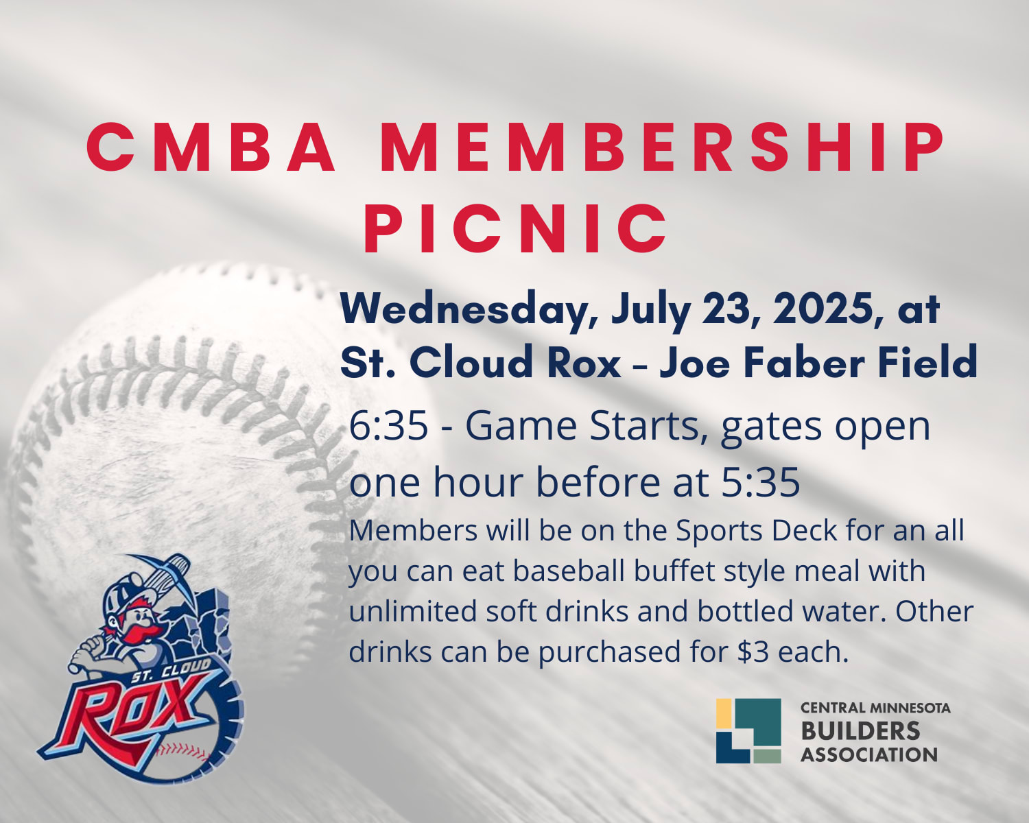 Sign up for a great time at the CMBA Picnic at the Rox Game at Joe Faber Field on Wednesday, July 23rd. Game starts at 6:35 PM, St. Cloud Rox vs Rochester. Gates open one hour before gametime, members will be on the Sports Deck for an all you can eat baseball buffet style meal with unlimited soft drinks and bottled water. Seltzers, craft and domestic beer can be purchased for $3 through the bottom of the 8th inning or 10 PM, whichever comes first.