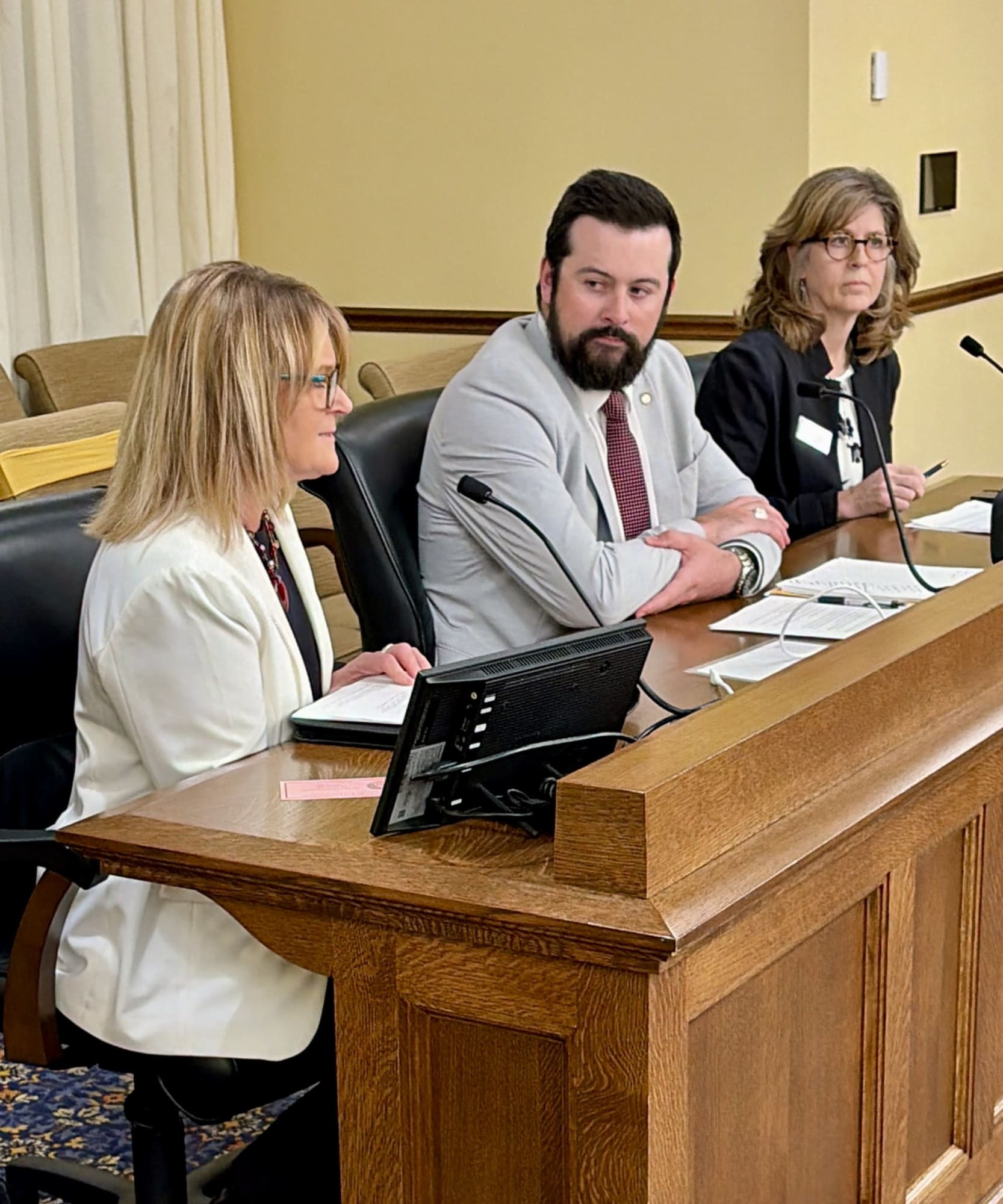 CMBA Executive Director, Wanda Schroeder (L) testifies at a hearing on the Starter Home Act at the Minnesota Capitol, while the bill's chief author, Representative Spencer Igo, looks on.